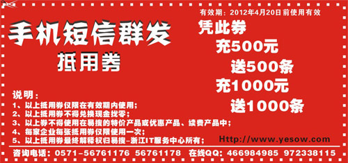这张抵价券是我们易搜刚出的易搜短信群发的优惠券。手机短信群发7分/条,凭此券只要充值500元,就可以送500条;充值1000元,就可以送1000条。
