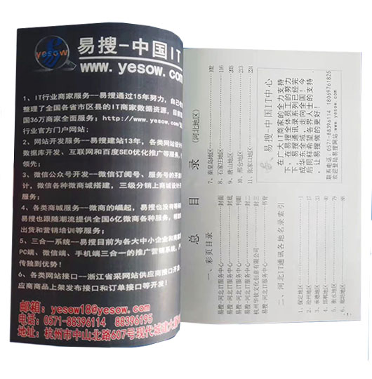 这本通讯录集结了我们全体员工的心血,精心,精诚,准确是我们的宗旨,对我们全体员工来说也是意义深刻,十年来,无数IT商家从易搜找到客户,我们也更努力,与您一同进步,如果您是河北的IT商家,那就赶快行动起来吧,或许下一个你的客户就在这本书中。